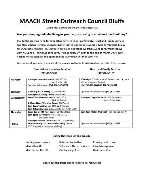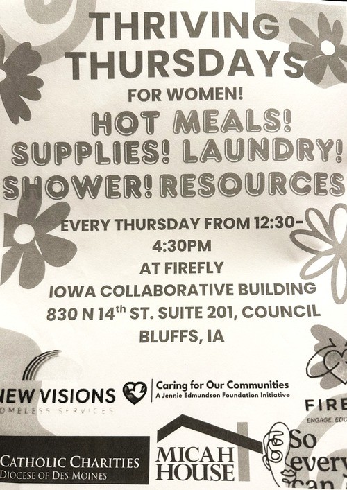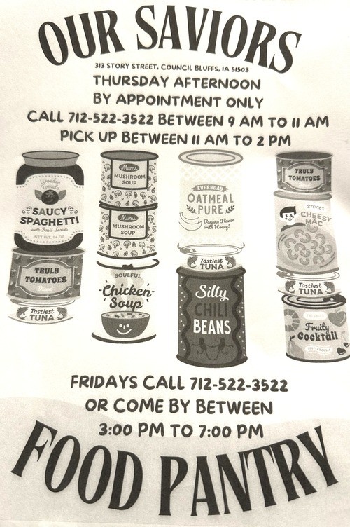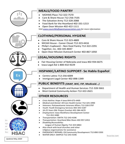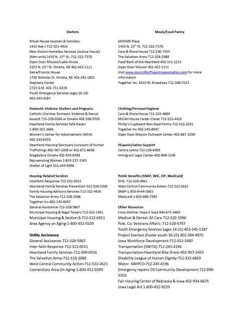 Here are some resources in the Council Bluffs area that might be able to help. (The resources and flyers are provided by other ministries. We do our best to keep them updated with the latest information we receive.)